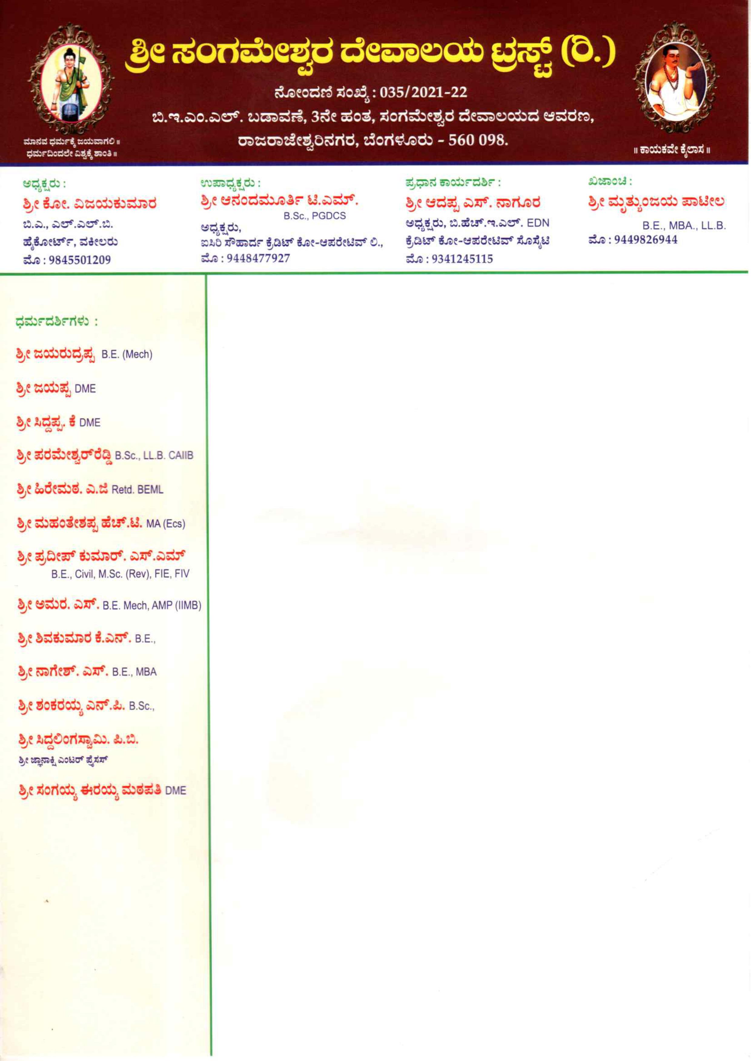 SHREE SANGAMESHWARA DEVALAYA TRUST has been formed. The trust has a group of like minded people from the Veerashaiva Lingayat community of Rajarajeshwari Nagar. The trust has various plans and will work towards to achieve it.